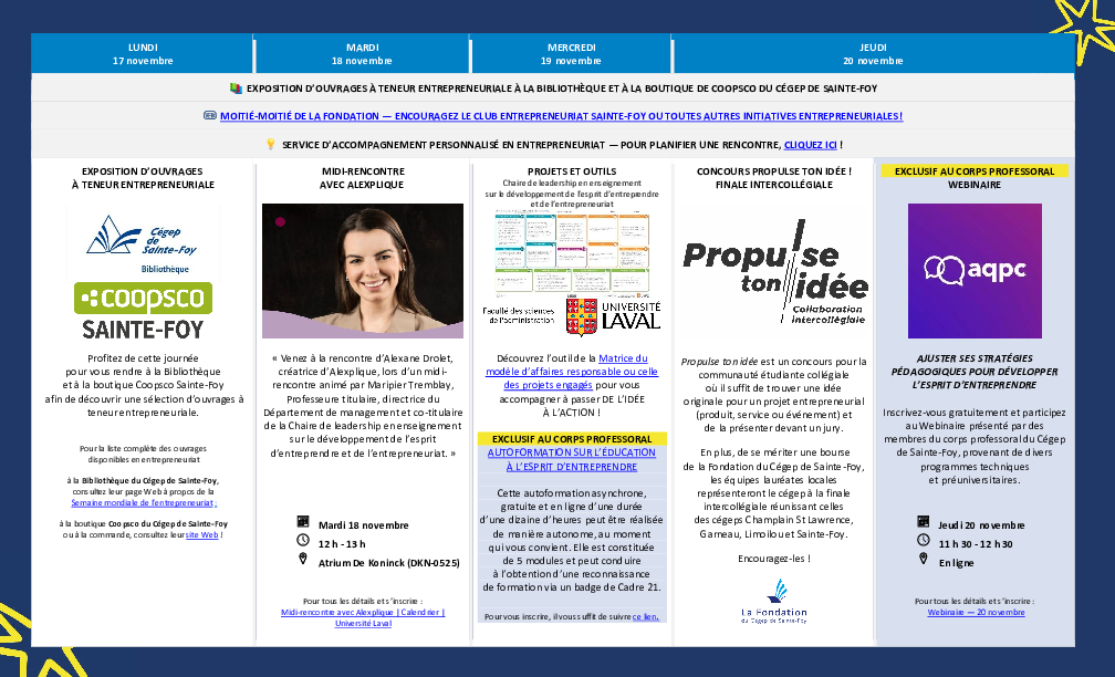 Que ce soit pour vous initier à l’entrepreneuriat, pour vous inspirer à passer DE L'IDÉE À L'ACTION ou pour rencontrer des personnes passionnées et créatives comme vous, Entrepreneuriat Sainte-Foy vous invite à participer aux activités de la semaine mondiale de l’entrepreneuriat qui se déroule du 17 au 21 novembre 2025.